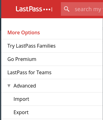 - Log into your LastPass account at www.lastpass.com and navigate to More Options (at the very bottom of the left sidebar menu) → Advanced → Export.