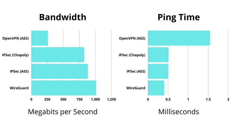 Combine that with smarter (and simpler) firewall protocols that leverage Elliptic Curve cryptography (as opposed to your grandfather’s RSA), it’s no wonder that we outperform all other hardware firewalls on VPN by a large margin. We offer up to a full Gigabit per Second (1000 Mbps) using WireGuard protocol. This outperforms all other corporate VPNs in the market by a significant margin.