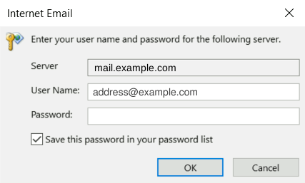 Outlook may ask for the password again — if so, this is normal (it’s asking for both the incoming and outgoing password, which are the same), so enter it again: