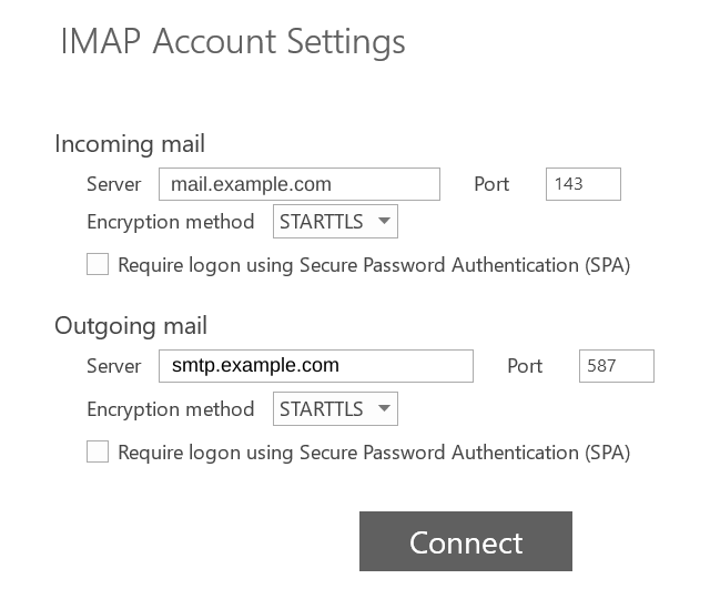 Make sure that the two “Require logon using Secure Password Authentication (SPA)” checkboxes are not checked.